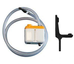 En option : Si l'évacuation des condensats par gravité n'est pas possible, une pompe de relevage peut-être intégrée à l'évaporateur et permet d'évacuer l'eau de condensation à travers un tuyau vers le réseau des eaux usées, un égout, etc..