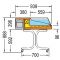 Les marchandises sont présentées sur le plancher du comptoir (L1424*P560mm), derrière un vitrage droit, avec un accès permettant au client de se servir lui-même. Côté vendeur, des vitres coulissantes en plexiglas permettent de disposer les marchandises. Un plan de travail en inox de 380mm de profondeur permet un stockage temporaire des produits ou des opérations de découpe et/ou d'emballage.