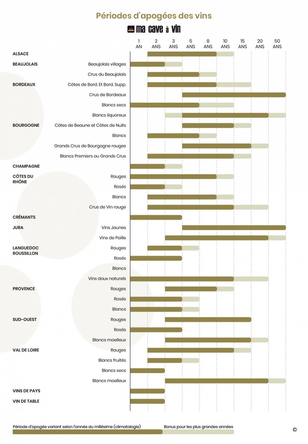Pour vous aider dans la définition de votre usage, vous pouvez consulter le diagramme sur l’âge de conservation et la période d’apogée des vins, ci-dessous :